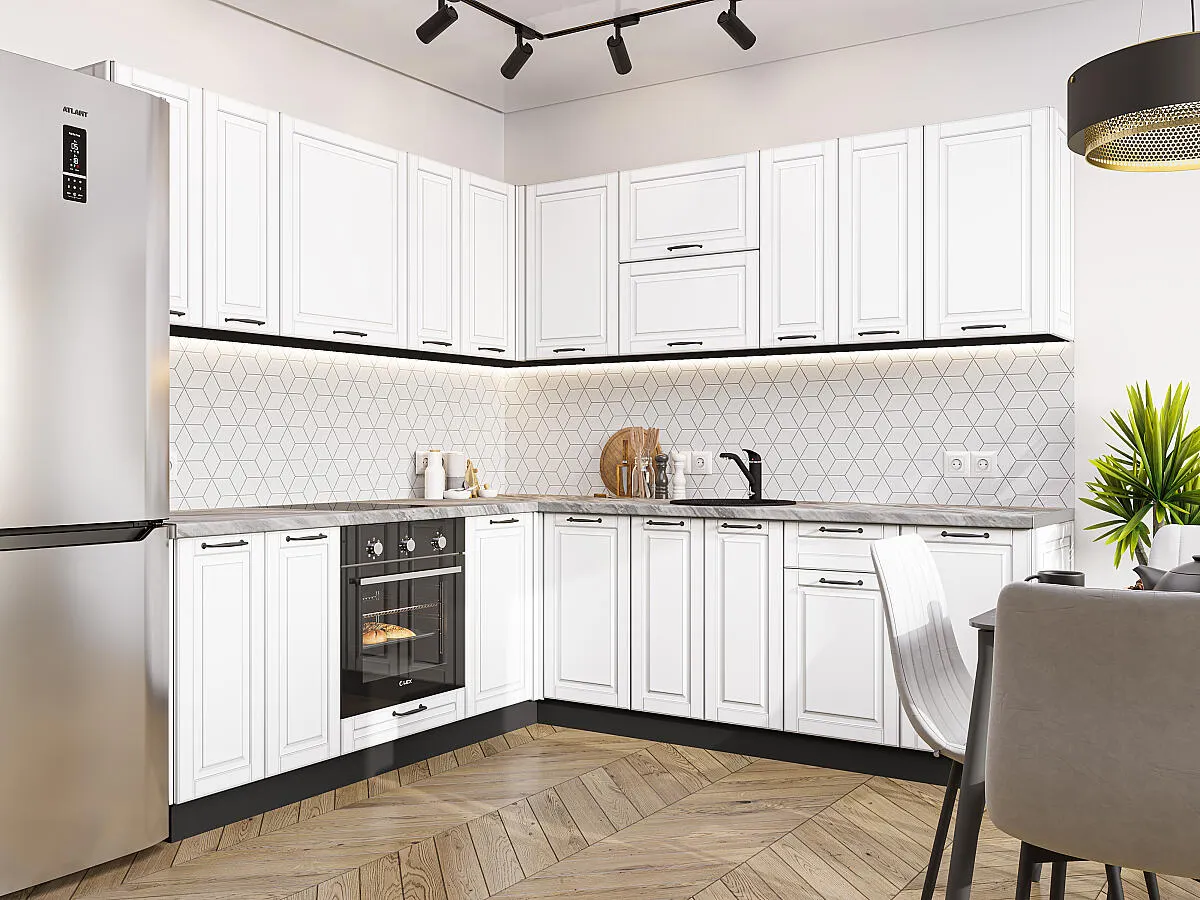 Дублин-02 Special White 74215.Расположение Угловая. Размер (В*Ш*Г) мм 2140*2200/2400*600. Цвет каркасов Graphite. Материал каркасов ЛДСП. Цвет фасадов Special White. Материал фасадов МДФ. Отделка фасадов Эмаль высокой прочности Renner (Италия).. Толщина кромки мм .Внимание Ручка в комплект не входит.. Стекло . Столешница Снежный мрамор. Толщина столешницы мм 38