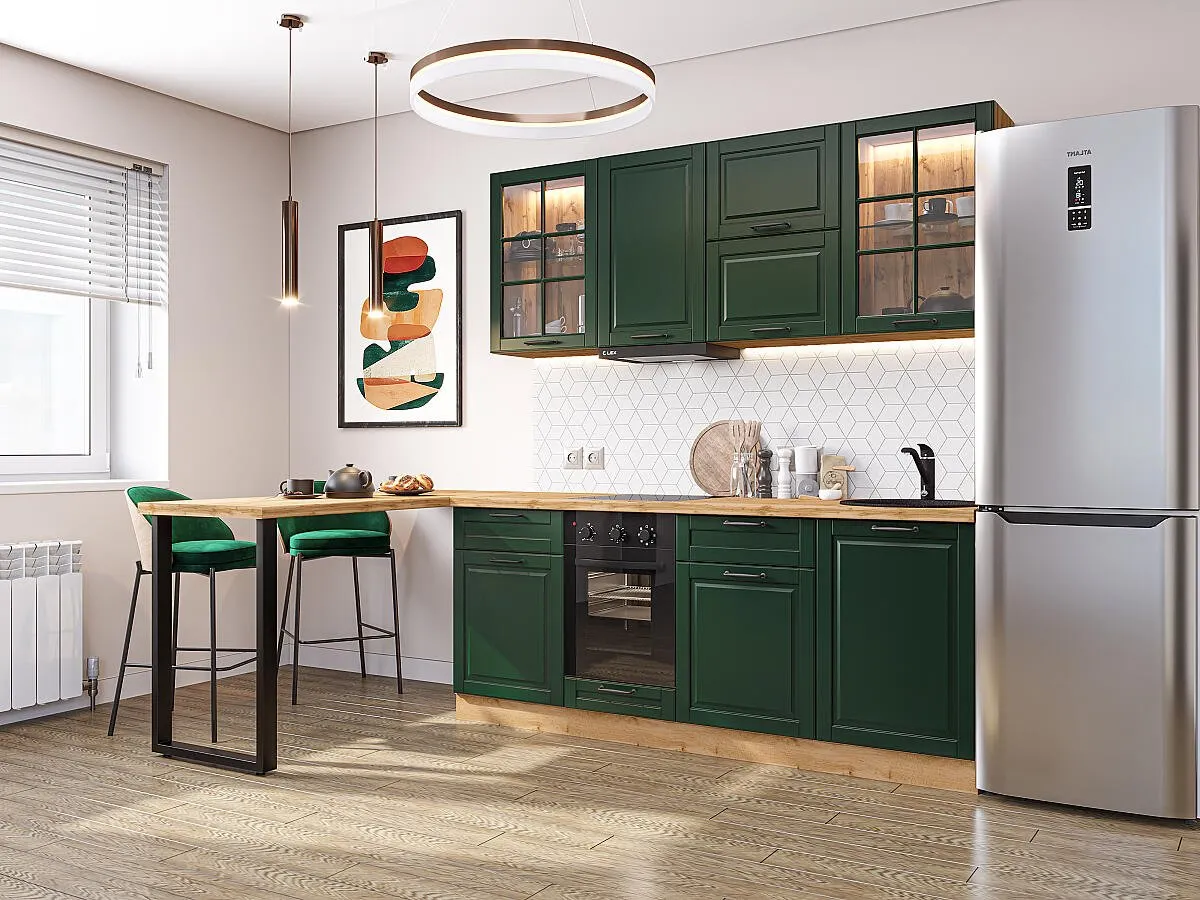 Дублин-03 Special Green 75040.Расположение Прямая. Размер (В*Ш*Г) мм 2140*1950*600. Цвет каркасов Дуб Вотан. Материал каркасов ЛДСП. Цвет фасадов Special Green. Материал фасадов МДФ/Стекло. Отделка фасадов Эмаль высокой прочности Renner (Италия).. Толщина кромки мм .Внимание Ручка в комплект не входит.. Стекло Стекло прозрачное.. Столешница Дуб натуральный. Толщина столешницы мм 38