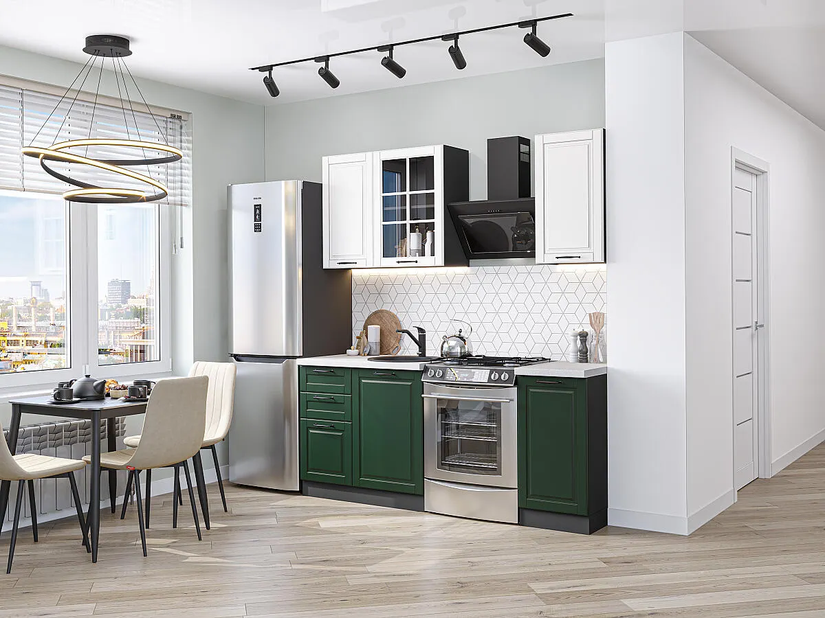 Дублин-04 Special White/Special Green 78619.Расположение Прямая. Размер (В*Ш*Г) мм 2140*1300*600. Цвет каркасов Graphite. Материал каркасов ЛДСП. Цвет фасадов Special White/Special Green. Материал фасадов МДФ. Отделка фасадов Эмаль высокой прочности Renner (Италия).. Толщина кромки мм .Внимание Ручка в комплект не входит.. Стекло Стекло прозрачное.. Столешница Антарес. Толщина столешницы мм 38