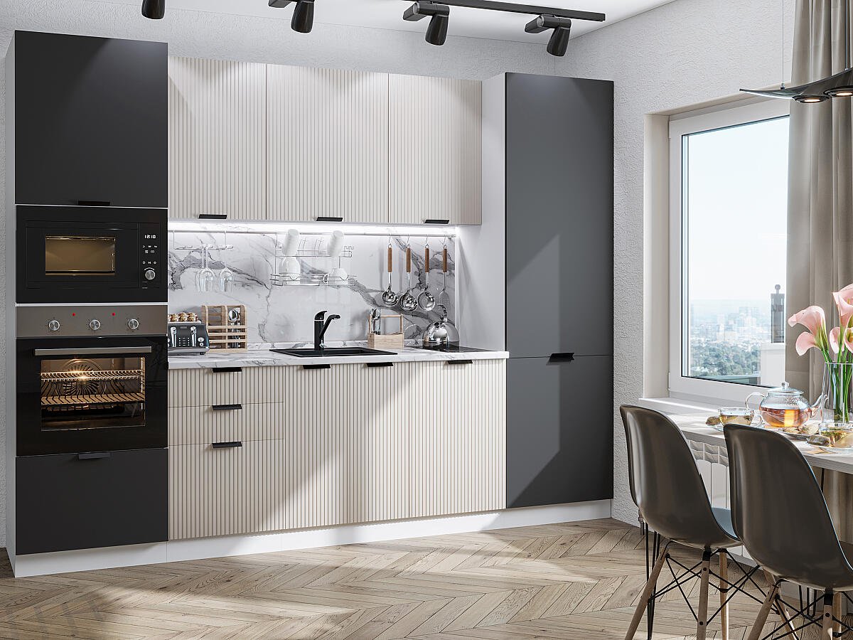 Евро Лайн-01 Агат/Антрацит 77592.Расположение Прямая. Размер (В*Ш*Г) мм 2140*2800*600. Цвет каркасов Белый. Материал каркасов ЛДСП. Цвет фасадов Агат/Антрацит. Материал фасадов МДФ. Отделка фасадов Пленка ПВХ.. Толщина кромки мм .Внимание Ручка в комплект не входит.. Стекло . Столешница Гранит белый глянец. Толщина столешницы мм 38