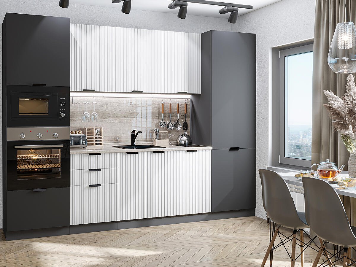 Евро Лайн-01 Белый/Антрацит 77591.Расположение Прямая. Размер (В*Ш*Г) мм 2140*2800*600. Цвет каркасов Graphite. Материал каркасов ЛДСП. Цвет фасадов Белый/Антрацит. Материал фасадов МДФ. Отделка фасадов Пленка ПВХ.. Толщина кромки мм .Внимание Ручка в комплект не входит.. Стекло . Столешница Песчаный камень глянец. Толщина столешницы мм 38