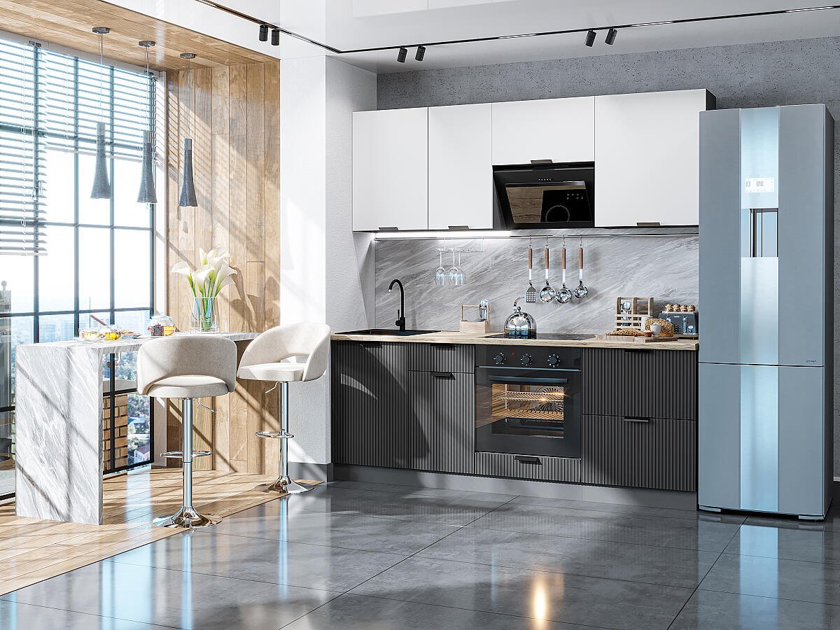 Евро Лайн-02 Белый/Антрацит 59767.Расположение Прямая. Размер (В*Ш*Г) мм 2140*2000*600. Цвет каркасов Graphite. Материал каркасов ЛДСП. Цвет фасадов Белый/Антрацит. Материал фасадов МДФ. Отделка фасадов Пленка ПВХ.. Толщина кромки мм .Внимание Ручка в комплект не входит.. Стекло . Столешница Редондо. Толщина столешницы мм 38