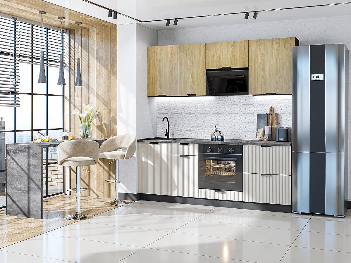 Евро Лайн-02 Дуб песочный/Агат 79779.Расположение Прямая. Размер (В*Ш*Г) мм 2140*2000*600. Цвет каркасов Graphite. Материал каркасов ЛДСП. Цвет фасадов Дуб песочный/Агат. Материал фасадов МДФ. Отделка фасадов Пленка ПВХ.. Толщина кромки мм .Внимание Ручка в комплект не входит.. Стекло . Столешница Черный детройт. Толщина столешницы мм 38