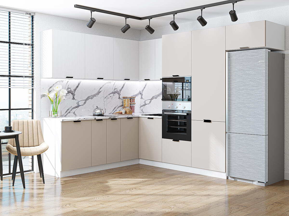 Евро Лайн-03 Агат/Белый 77594.Расположение Угловая. Размер (В*Ш*Г) мм 2140*2150/2800*600. Цвет каркасов Белый. Материал каркасов ЛДСП. Цвет фасадов Агат/Белый. Материал фасадов МДФ. Отделка фасадов Пленка ПВХ.. Толщина кромки мм .Внимание Ручка в комплект не входит.. Стекло . Столешница Гранит белый глянец. Толщина столешницы мм 38