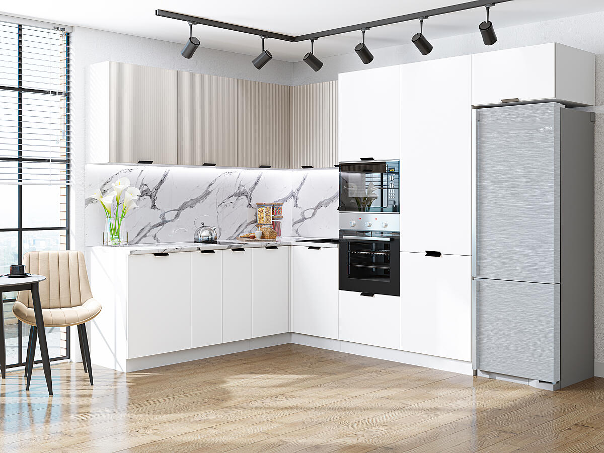 Евро Лайн-03 Белый/Агат 77593.Расположение Угловая. Размер (В*Ш*Г) мм 2140*2150/2800*600. Цвет каркасов Белый. Материал каркасов ЛДСП. Цвет фасадов Белый/Агат. Материал фасадов МДФ. Отделка фасадов Пленка ПВХ.. Толщина кромки мм .Внимание Ручка в комплект не входит.. Стекло . Столешница Гранит белый глянец. Толщина столешницы мм 38