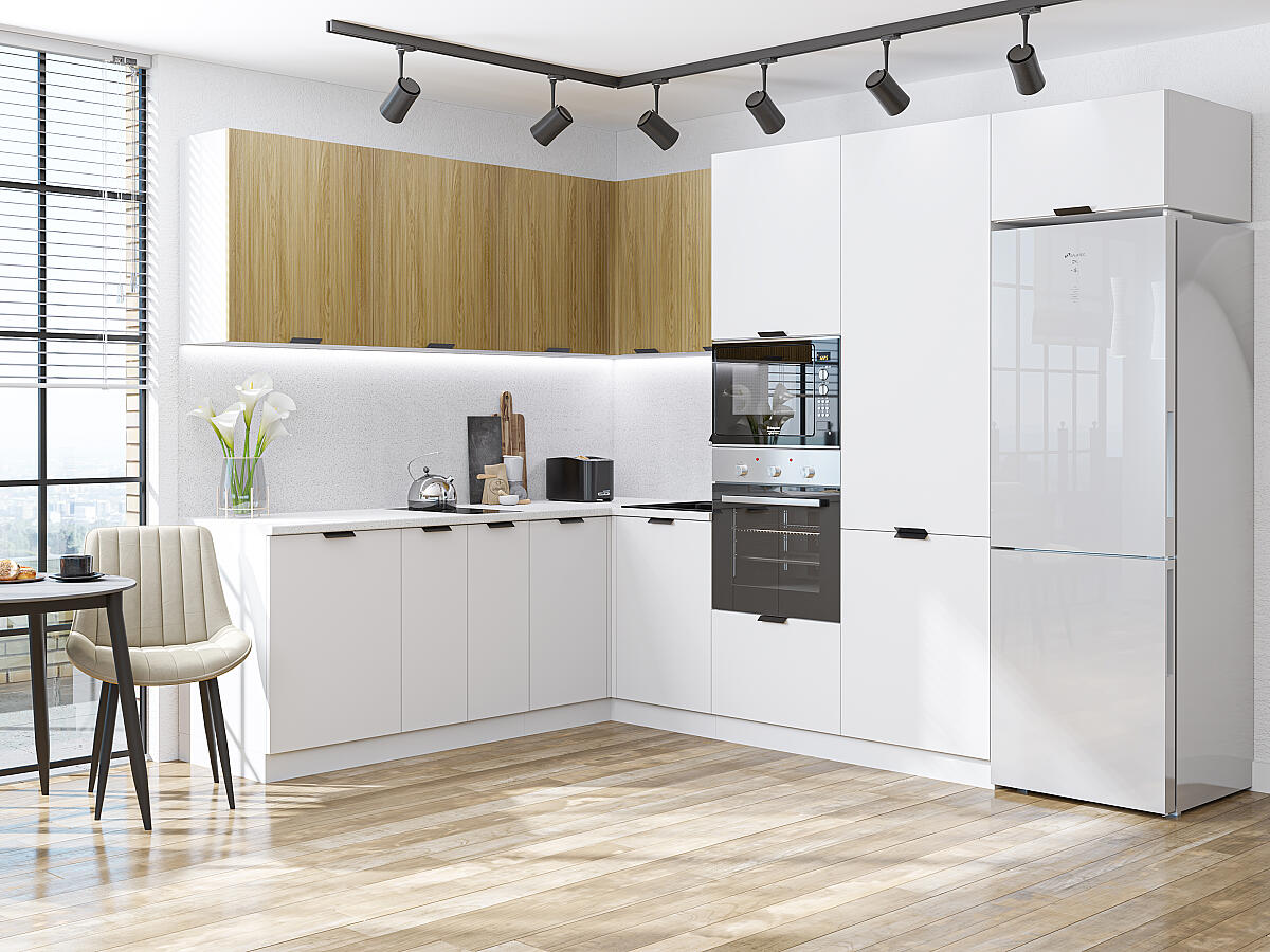 Евро Лайн-03 Дуб песочный/Белый 79780.Расположение Угловая. Размер (В*Ш*Г) мм 2140*2150/2800*600. Цвет каркасов Белый. Материал каркасов ЛДСП. Цвет фасадов Дуб песочный/Белый. Материал фасадов МДФ. Отделка фасадов Пленка ПВХ.. Толщина кромки мм .Внимание Ручка в комплект не входит.. Стекло . Столешница Антарес. Толщина столешницы мм 38