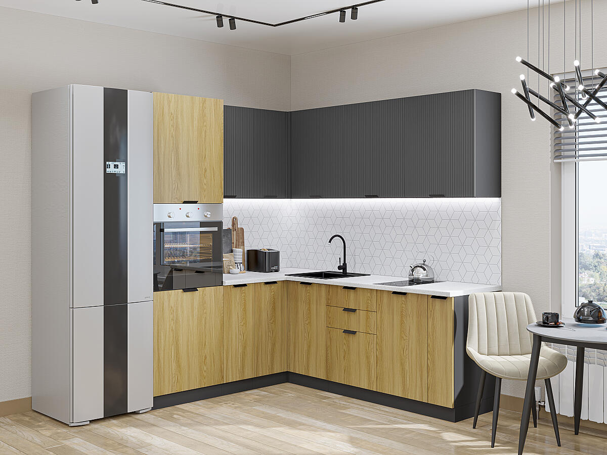 Евро Лайн-04 Антрацит/Дуб песочный 79785.Расположение Угловая. Размер (В*Ш*Г) мм 2140*1800/2150*600. Цвет каркасов Graphite. Материал каркасов ЛДСП. Цвет фасадов Антрацит/Дуб песочный. Материал фасадов МДФ. Отделка фасадов Пленка ПВХ.. Толщина кромки мм .Внимание Ручка в комплект не входит.. Стекло . Столешница Антарес. Толщина столешницы мм 38