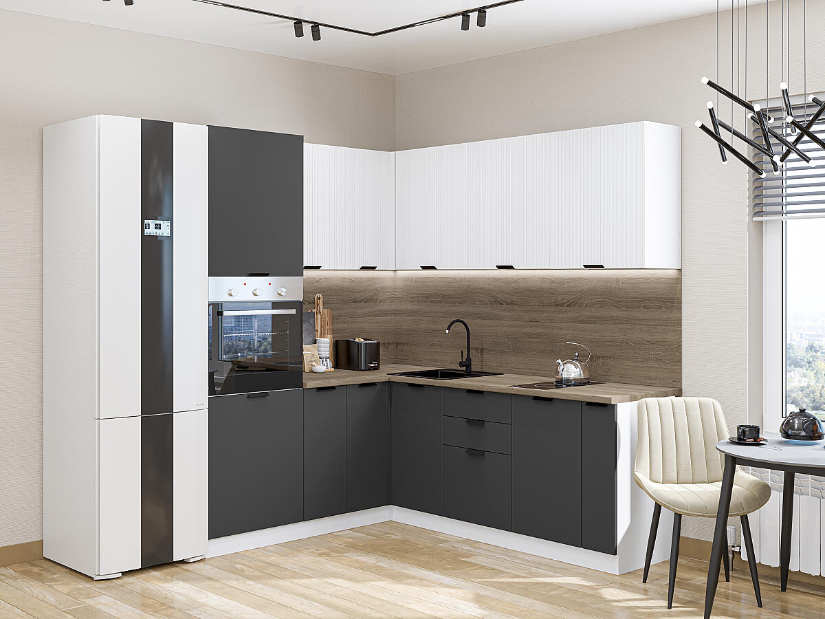 Евро Лайн-04 Белый/Антрацит 77600.Расположение Угловая. Размер (В*Ш*Г) мм 2140*1800/2150*600. Цвет каркасов Белый. Материал каркасов ЛДСП. Цвет фасадов Белый/Антрацит. Материал фасадов МДФ. Отделка фасадов Пленка ПВХ.. Толщина кромки мм .Внимание Ручка в комплект не входит.. Стекло . Столешница Дуб табак. Толщина столешницы мм 38