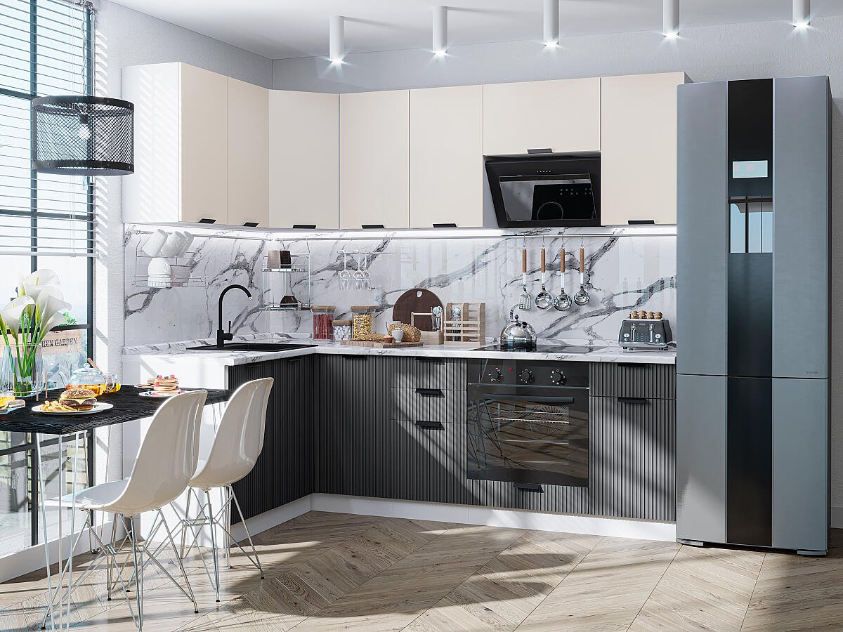 Евро Лайн-05 Агат/Антрацит 77604.Расположение Угловая. Размер (В*Ш*Г) мм 2140*1400/2400*600. Цвет каркасов Белый. Материал каркасов ЛДСП. Цвет фасадов Агат/Антрацит. Материал фасадов МДФ. Отделка фасадов Пленка ПВХ.. Толщина кромки мм .Внимание Ручка в комплект не входит.. Стекло . Столешница Гранит белый глянец. Толщина столешницы мм 38