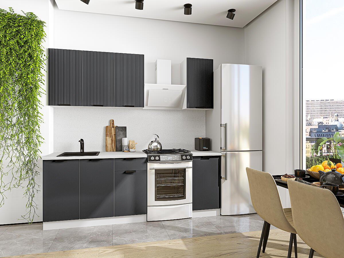 Евро Лайн-06 Антрацит 78630.Расположение Прямая. Размер (В*Ш*Г) мм 2140*1400*600. Цвет каркасов Белый. Материал каркасов ЛДСП. Цвет фасадов Антрацит. Материал фасадов МДФ. Отделка фасадов Пленка ПВХ.. Толщина кромки мм .Внимание Ручка в комплект не входит.. Стекло . Столешница Антарес. Толщина столешницы мм 38