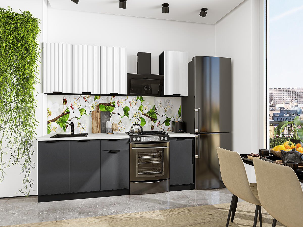 Евро Лайн-06 Белый/Антрацит 78635.Расположение Прямая. Размер (В*Ш*Г) мм 2140*1400*600. Цвет каркасов Graphite. Материал каркасов ЛДСП. Цвет фасадов Белый/Антрацит. Материал фасадов МДФ. Отделка фасадов Пленка ПВХ.. Толщина кромки мм .Внимание Ручка в комплект не входит.. Стекло . Столешница Антарес. Толщина столешницы мм 38