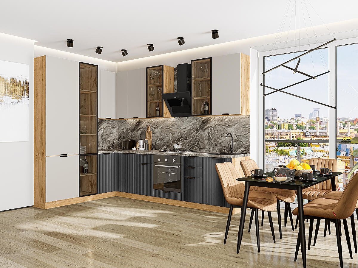 Евро Лайн-07 Агат/Антрацит 79632.Расположение Прямая. Размер (В*Ш*Г) мм 2340*2000/3000*600. Цвет каркасов Дуб Вотан. Материал каркасов ЛДСП. Цвет фасадов Агат/Антрацит. Материал фасадов МДФ. Отделка фасадов Пленка ПВХ.. Толщина кромки мм .Внимание Ручка в комплект не входит.. Стекло . Столешница Мрамор горный. Толщина столешницы мм 38