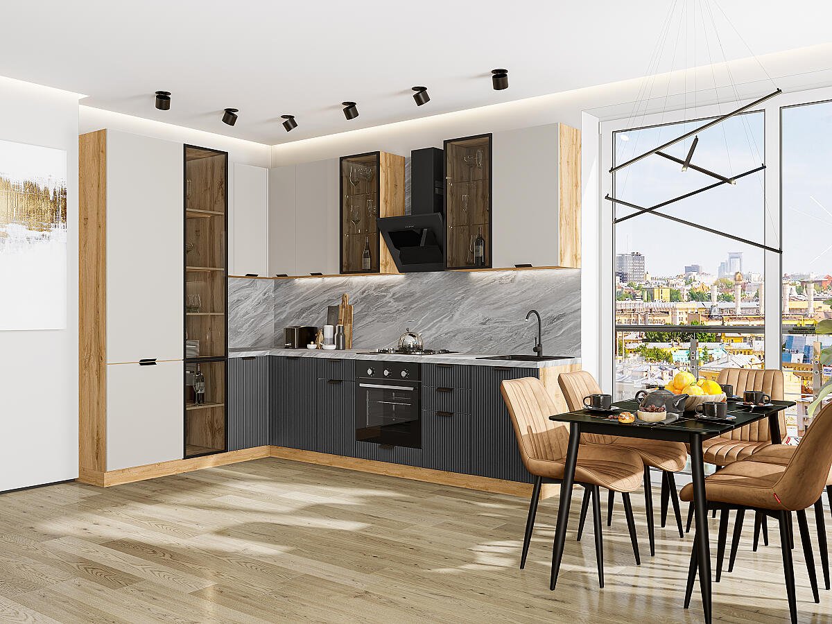 Евро Лайн-07 Агат/Антрацит 79713.Расположение Прямая. Размер (В*Ш*Г) мм 2340*2000/3000*600. Цвет каркасов Дуб Вотан. Материал каркасов ЛДСП. Цвет фасадов Агат/Антрацит. Материал фасадов МДФ. Отделка фасадов Пленка ПВХ.. Толщина кромки мм .Внимание Ручка в комплект не входит.. Стекло . Столешница Снежный мрамор. Толщина столешницы мм 38