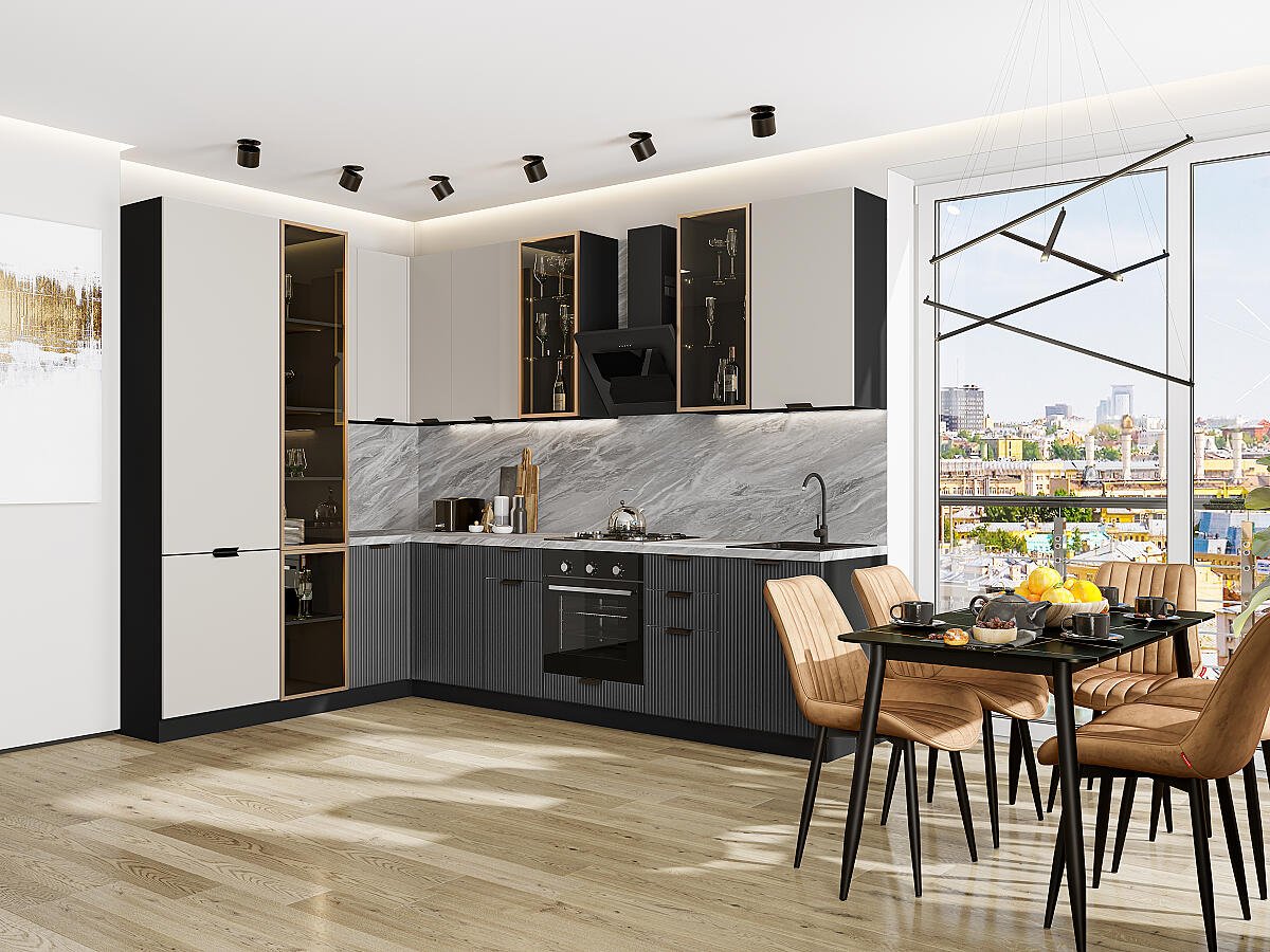 Евро Лайн-07 Агат/Антрацит 79714.Расположение Прямая. Размер (В*Ш*Г) мм 2340*2000/3000*600. Цвет каркасов Graphite. Материал каркасов ЛДСП. Цвет фасадов Агат/Антрацит. Материал фасадов МДФ. Отделка фасадов Пленка ПВХ.. Толщина кромки мм .Внимание Ручка в комплект не входит.. Стекло . Столешница Снежный мрамор. Толщина столешницы мм 38