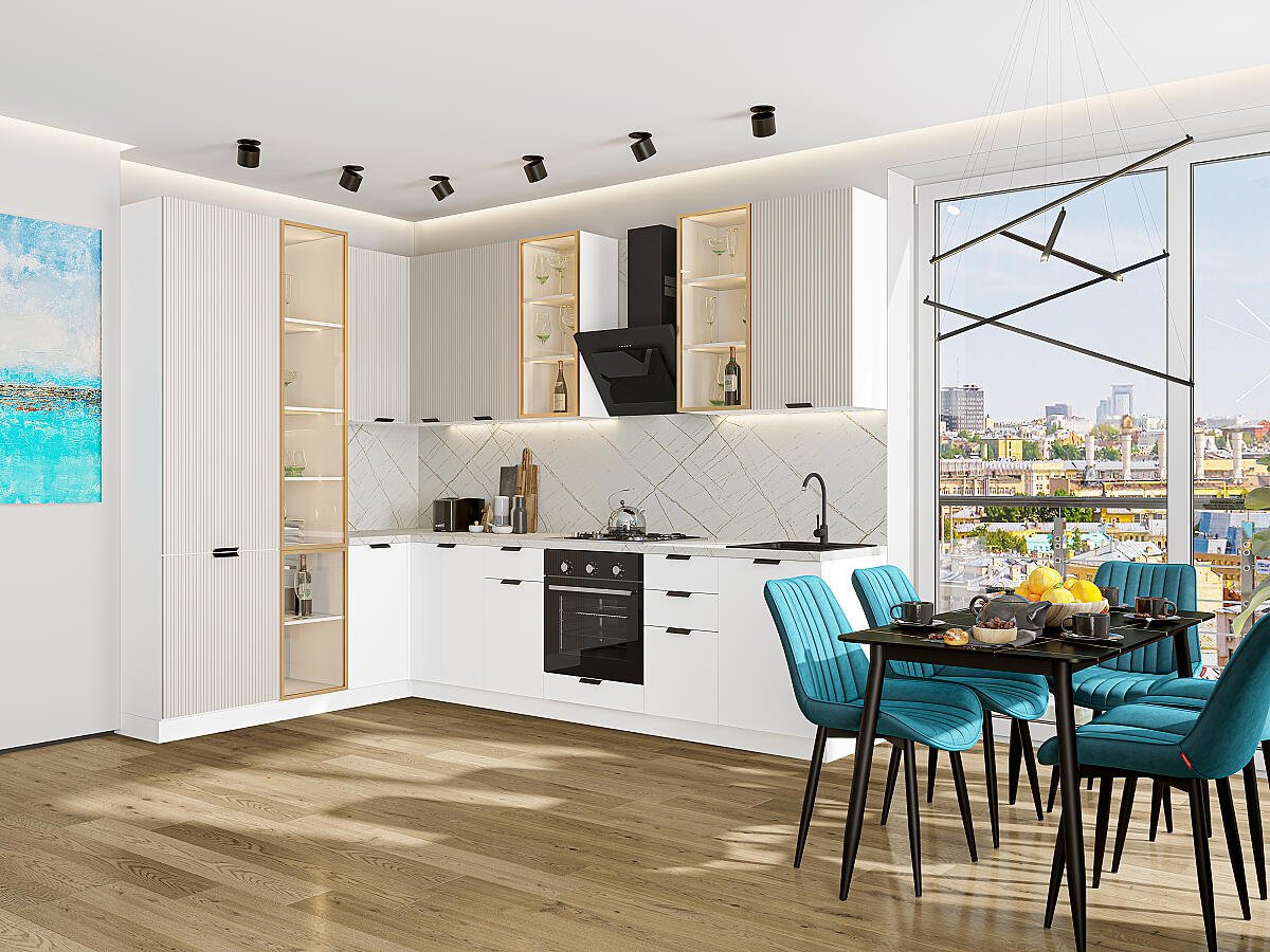 Евро Лайн-07 Агат/Белый 79628.Расположение Прямая. Размер (В*Ш*Г) мм 2340*2000/3000*600. Цвет каркасов Белый. Материал каркасов ЛДСП. Цвет фасадов Агат/Белый. Материал фасадов МДФ. Отделка фасадов Пленка ПВХ.. Толщина кромки мм .Внимание Ручка в комплект не входит.. Стекло . Столешница Пирит светлый. Толщина столешницы мм 38