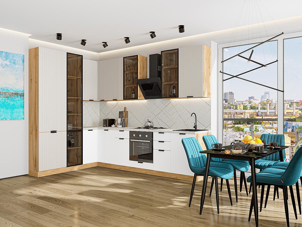 Евро Лайн-07 Агат/Белый 79629.Расположение Прямая. Размер (В*Ш*Г) мм 2340*2000/3000*600. Цвет каркасов Дуб Вотан. Материал каркасов ЛДСП. Цвет фасадов Агат/Белый. Материал фасадов МДФ. Отделка фасадов Пленка ПВХ.. Толщина кромки мм .Внимание Ручка в комплект не входит.. Стекло . Столешница Пирит светлый. Толщина столешницы мм 38