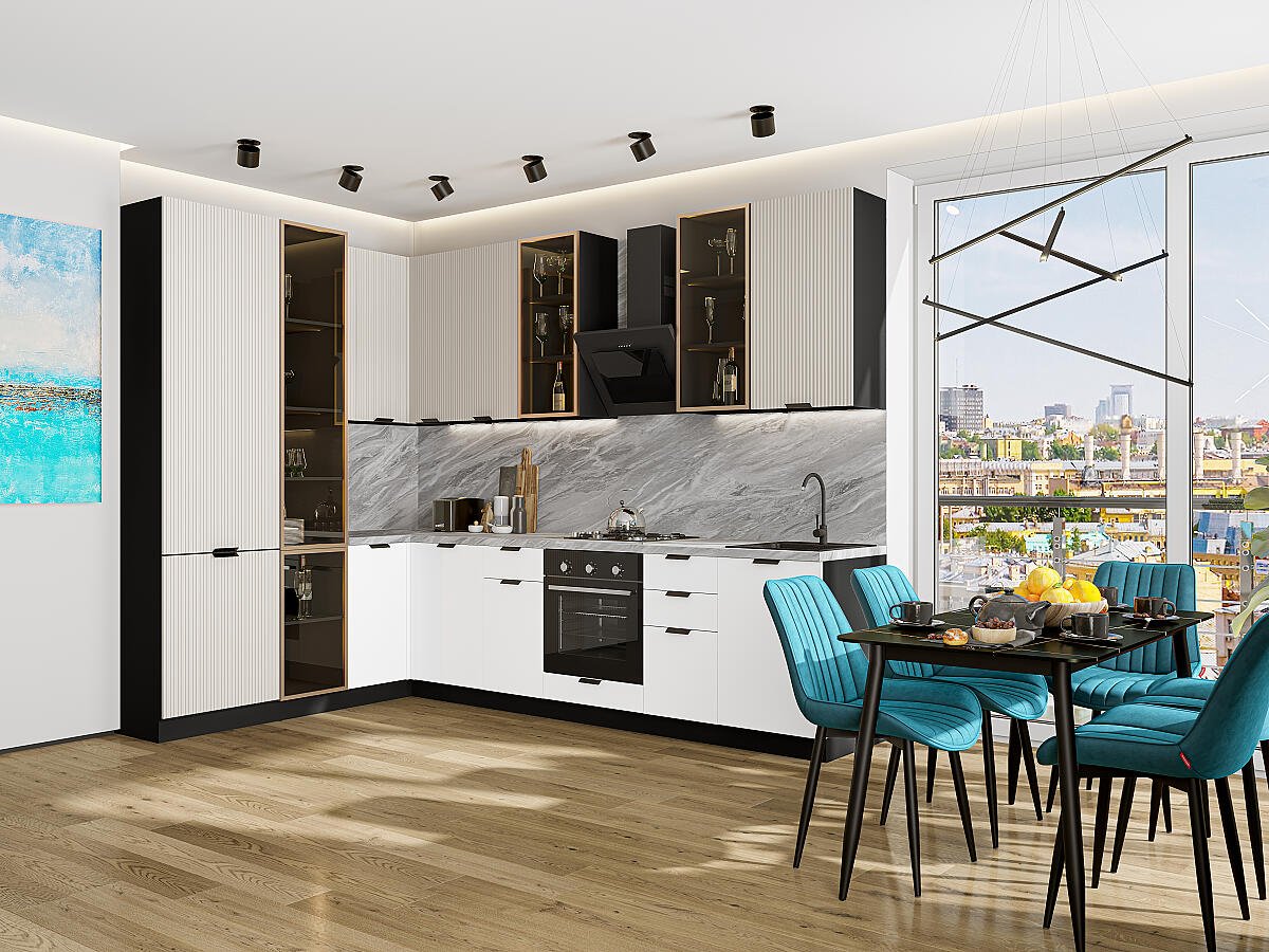 Евро Лайн-07 Агат/Белый 79630.Расположение Прямая. Размер (В*Ш*Г) мм 2340*2000/3000*600. Цвет каркасов Graphite. Материал каркасов ЛДСП. Цвет фасадов Агат/Белый. Материал фасадов МДФ. Отделка фасадов Пленка ПВХ.. Толщина кромки мм .Внимание Ручка в комплект не входит.. Стекло . Столешница Снежный мрамор. Толщина столешницы мм 38