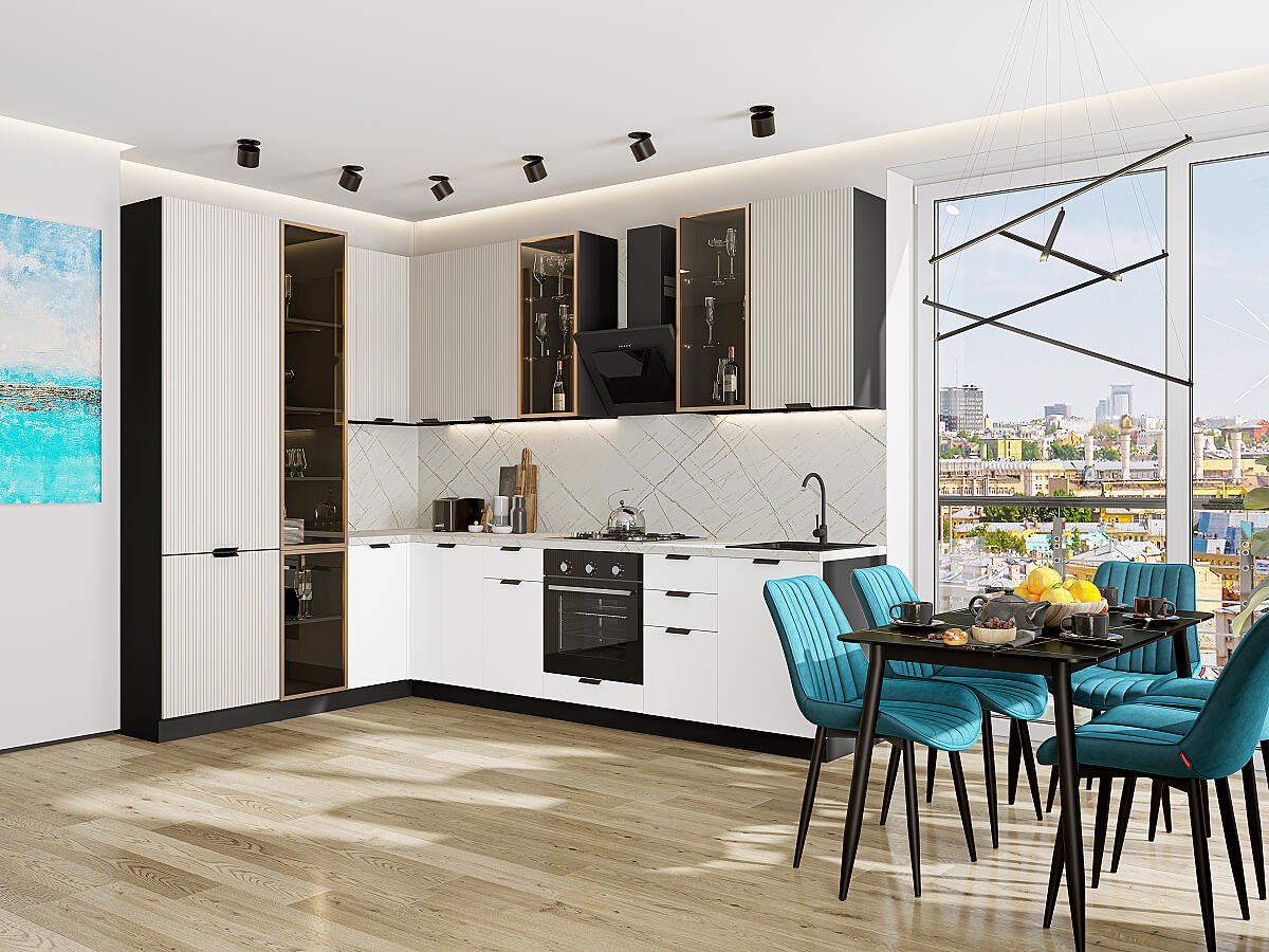 Евро Лайн-07 Агат/Белый 79711.Расположение Прямая. Размер (В*Ш*Г) мм 2340*2000/3000*600. Цвет каркасов Graphite. Материал каркасов ЛДСП. Цвет фасадов Агат/Белый. Материал фасадов МДФ. Отделка фасадов Пленка ПВХ.. Толщина кромки мм .Внимание Ручка в комплект не входит.. Стекло . Столешница Пирит светлый. Толщина столешницы мм 38