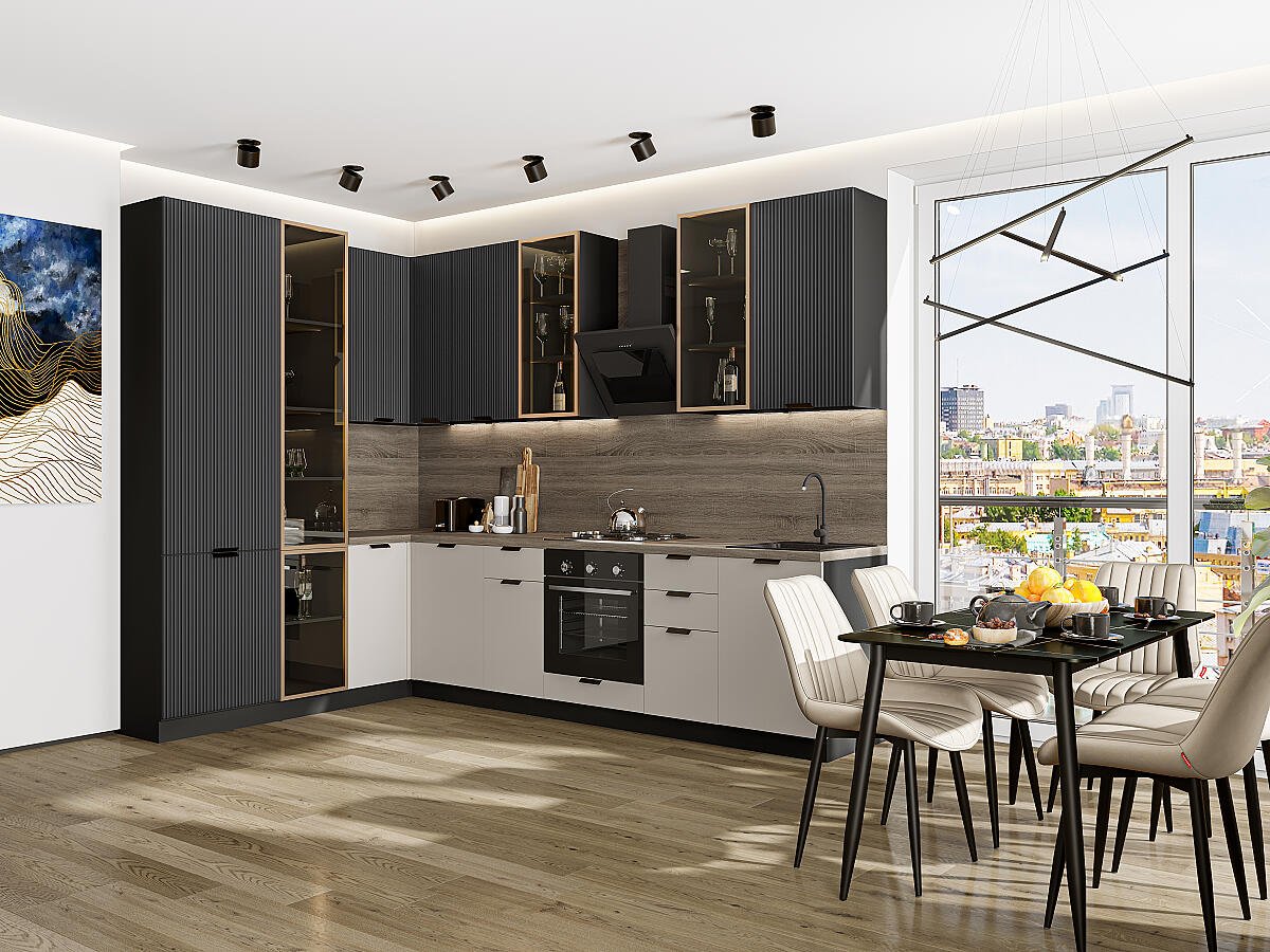 Евро Лайн-07 Антрацит/Агат 79639.Расположение Прямая. Размер (В*Ш*Г) мм 2340*2000/3000*600. Цвет каркасов Graphite. Материал каркасов ЛДСП. Цвет фасадов Антрацит/Агат. Материал фасадов МДФ. Отделка фасадов Пленка ПВХ.. Толщина кромки мм .Внимание Ручка в комплект не входит.. Стекло . Столешница Дуб табак. Толщина столешницы мм 38