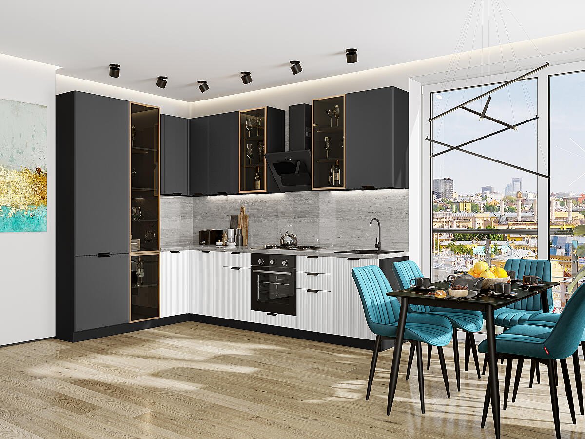 Евро Лайн-07 Антрацит/Белый 79636.Расположение Прямая. Размер (В*Ш*Г) мм 2340*2000/3000*600. Цвет каркасов Graphite. Материал каркасов ЛДСП. Цвет фасадов Антрацит/Белый. Материал фасадов МДФ. Отделка фасадов Пленка ПВХ.. Толщина кромки мм .Внимание Ручка в комплект не входит.. Стекло . Столешница Снежный мрамор. Толщина столешницы мм 38