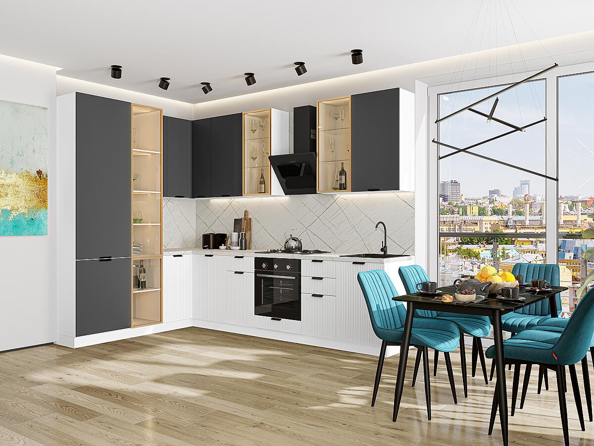 Евро Лайн-07 Антрацит/Белый 79715.Расположение Прямая. Размер (В*Ш*Г) мм 2340*2000/3000*600. Цвет каркасов Белый. Материал каркасов ЛДСП. Цвет фасадов Антрацит/Белый. Материал фасадов МДФ. Отделка фасадов Пленка ПВХ.. Толщина кромки мм .Внимание Ручка в комплект не входит.. Стекло . Столешница Пирит светлый. Толщина столешницы мм 38