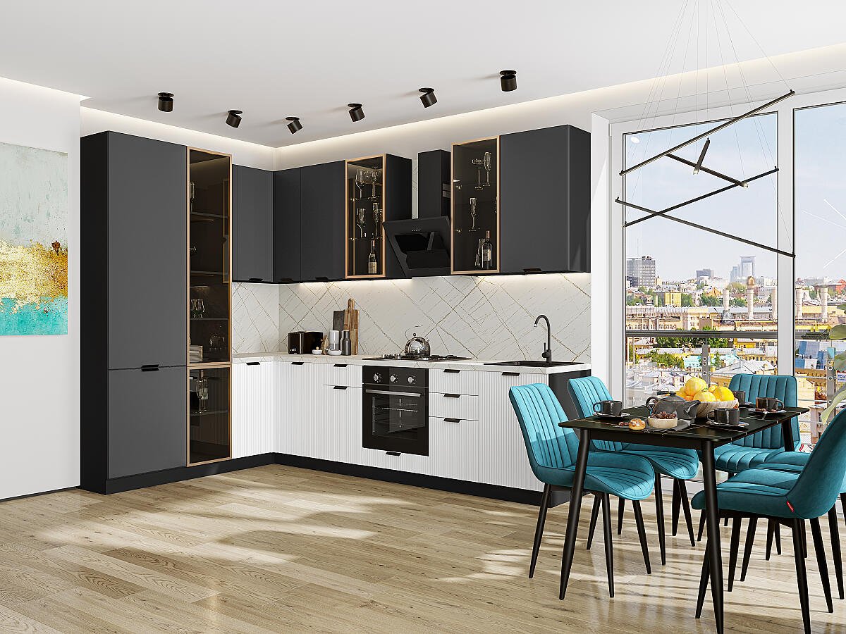 Евро Лайн-07 Антрацит/Белый 79717.Расположение Прямая. Размер (В*Ш*Г) мм 2340*2000/3000*600. Цвет каркасов Graphite. Материал каркасов ЛДСП. Цвет фасадов Антрацит/Белый. Материал фасадов МДФ. Отделка фасадов Пленка ПВХ.. Толщина кромки мм .Внимание Ручка в комплект не входит.. Стекло . Столешница Пирит светлый. Толщина столешницы мм 38