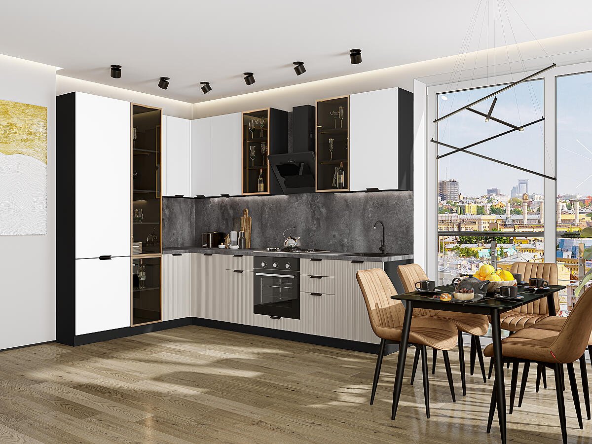 Евро Лайн-07 Белый/Агат 79624.Расположение Прямая. Размер (В*Ш*Г) мм 2340*2000/3000*600. Цвет каркасов Graphite. Материал каркасов ЛДСП. Цвет фасадов Белый/Агат. Материал фасадов МДФ. Отделка фасадов Пленка ПВХ.. Толщина кромки мм .Внимание Ручка в комплект не входит.. Стекло . Столешница Черный детройт. Толщина столешницы мм 38