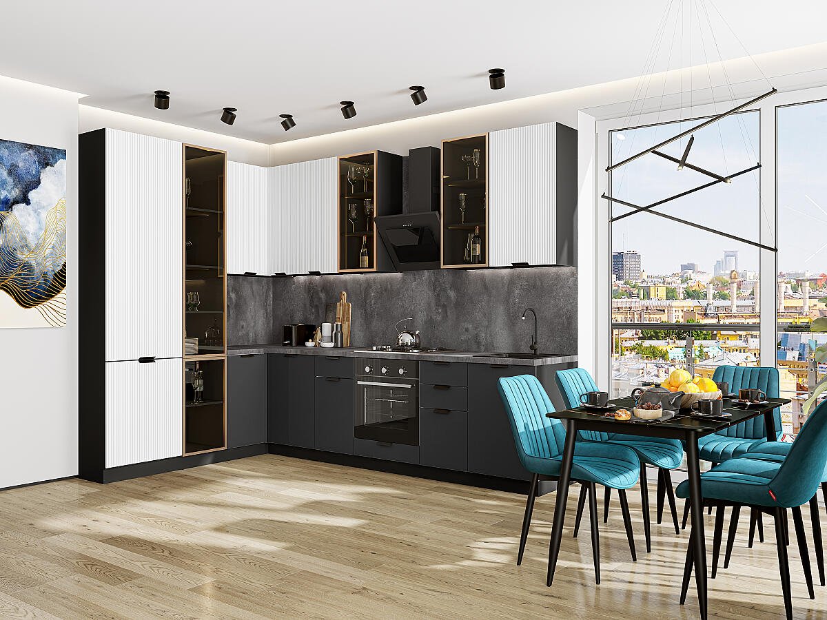 Евро Лайн-07 Белый/Антрацит 79627.Расположение Прямая. Размер (В*Ш*Г) мм 2340*2000/3000*600. Цвет каркасов Graphite. Материал каркасов ЛДСП. Цвет фасадов Белый/Антрацит. Материал фасадов МДФ. Отделка фасадов Пленка ПВХ.. Толщина кромки мм .Внимание Ручка в комплект не входит.. Стекло . Столешница Черный детройт. Толщина столешницы мм 38