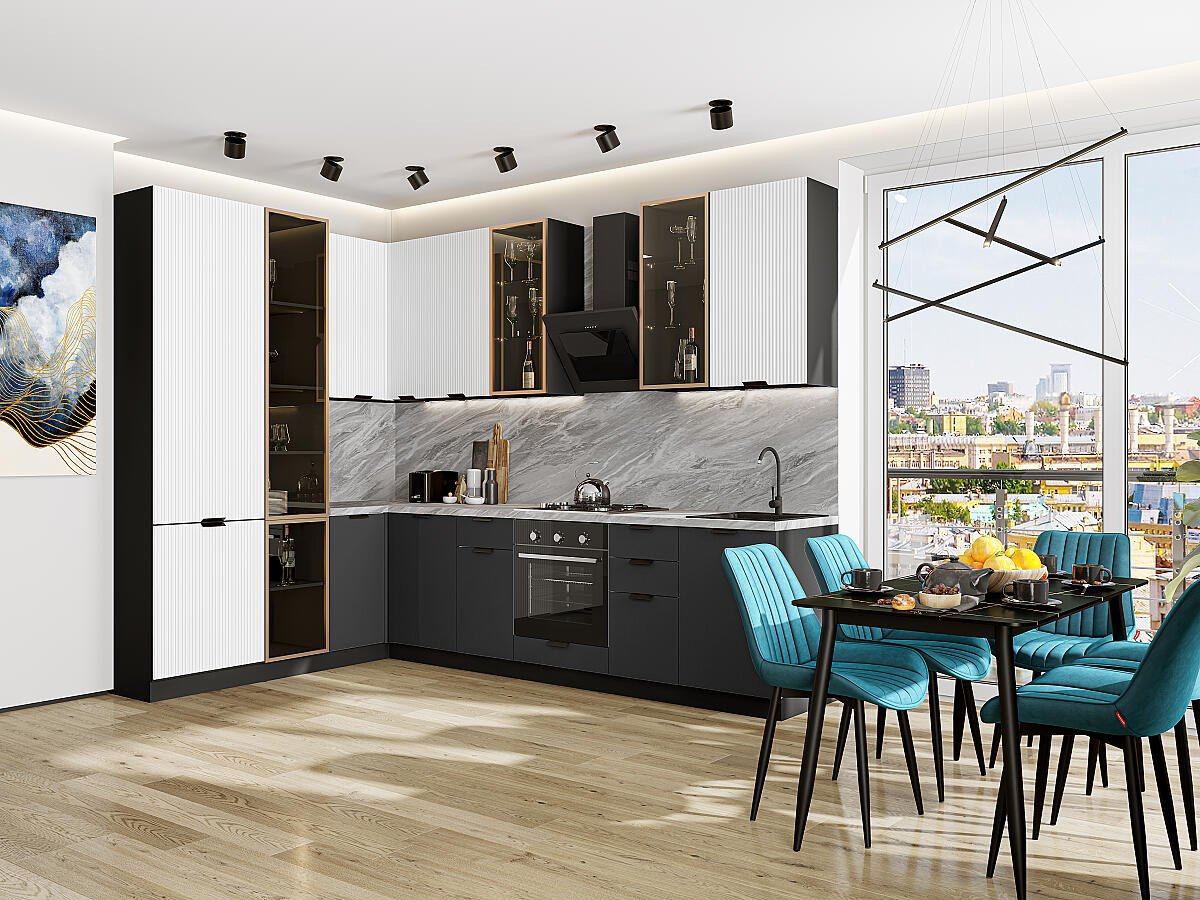 Евро Лайн-07 Белый/Антрацит 79708.Расположение Прямая. Размер (В*Ш*Г) мм 2340*2000/3000*600. Цвет каркасов Graphite. Материал каркасов ЛДСП. Цвет фасадов Белый/Антрацит. Материал фасадов МДФ. Отделка фасадов Пленка ПВХ.. Толщина кромки мм .Внимание Ручка в комплект не входит.. Стекло . Столешница Снежный мрамор. Толщина столешницы мм 38