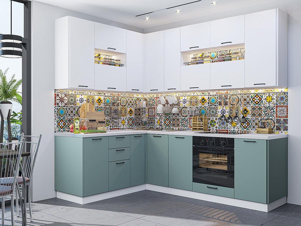 Флэт-02 White In 2S/Grey-green In 2S 57231.Расположение Угловая. Размер (В*Ш*Г) мм 2340*1700/2400*600. Цвет каркасов Белый. Материал каркасов ЛДСП. Цвет фасадов White In 2S/Grey-green In 2S. Материал фасадов ЛДСП. Отделка фасадов . Толщина кромки мм 1.Внимание Ручка в комплект не входит.. Стекло . Столешница Антарес. Толщина столешницы мм 38