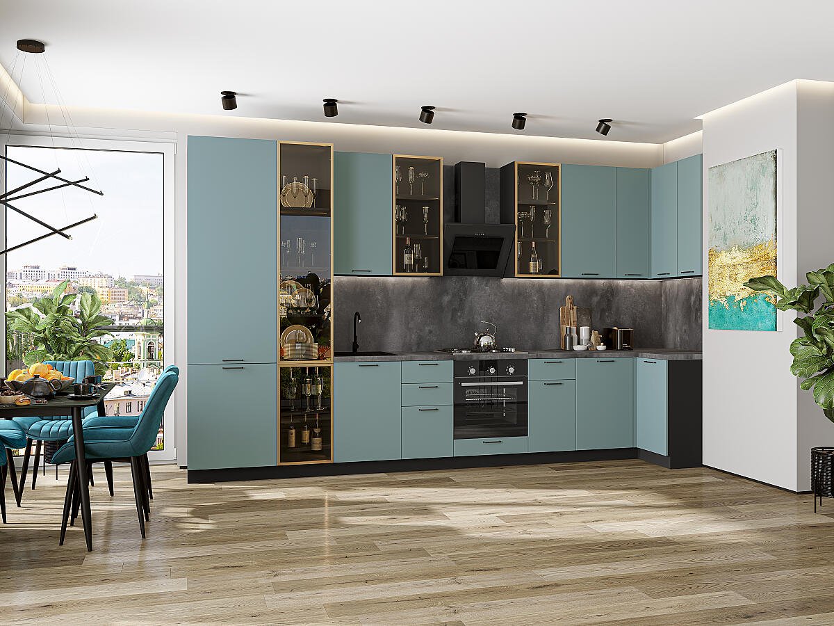 Флэт-05 Grey-green In 2S 79606.Расположение Угловая. Размер (В*Ш*Г) мм 2340*4000/1000*600. Цвет каркасов Graphite. Материал каркасов ЛДСП. Цвет фасадов Grey-green In 2S. Материал фасадов ЛДСП. Отделка фасадов . Толщина кромки мм 1.Внимание Ручка в комплект не входит.. Стекло . Столешница Черный детройт. Толщина столешницы мм 38