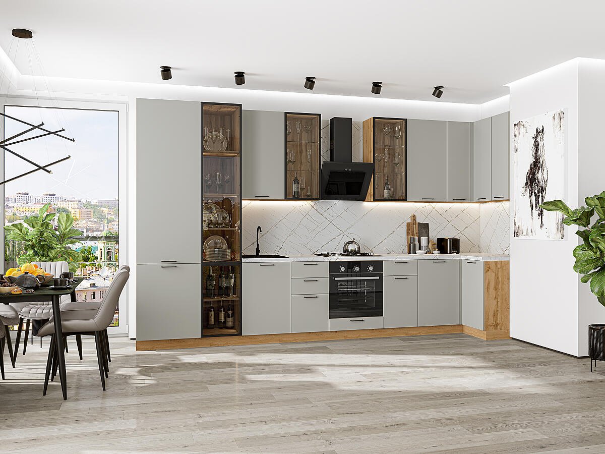 Флэт-05 Light Grey In 2S 79683.Расположение Угловая. Размер (В*Ш*Г) мм 2340*4000/1000*600. Цвет каркасов Дуб Вотан. Материал каркасов ЛДСП. Цвет фасадов Light Grey In 2S. Материал фасадов ЛДСП. Отделка фасадов . Толщина кромки мм 1.Внимание Ручка в комплект не входит.. Стекло . Столешница Пирит светлый. Толщина столешницы мм 38