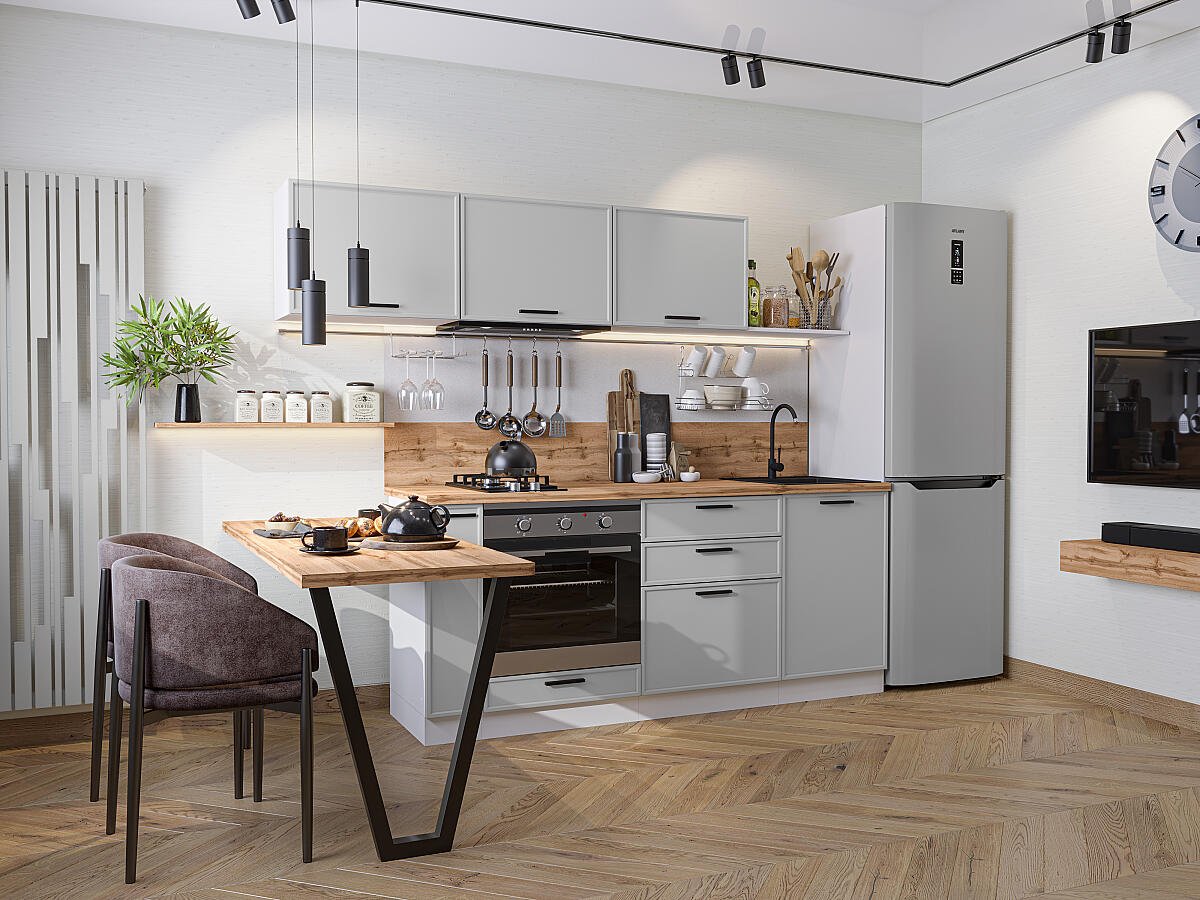 Фрейм-01 Grey Silk 70029.Расположение Прямая. Размер (В*Ш*Г) мм 1782*2300*600. Цвет каркасов Белый. Материал каркасов ЛДСП. Цвет фасадов Grey Silk. Материал фасадов МДФ. Отделка фасадов ПЭТ. Толщина кромки мм .Внимание Ручка в комплект не входит.. Стекло . Столешница Дуб натуральный. Толщина столешницы мм 38
