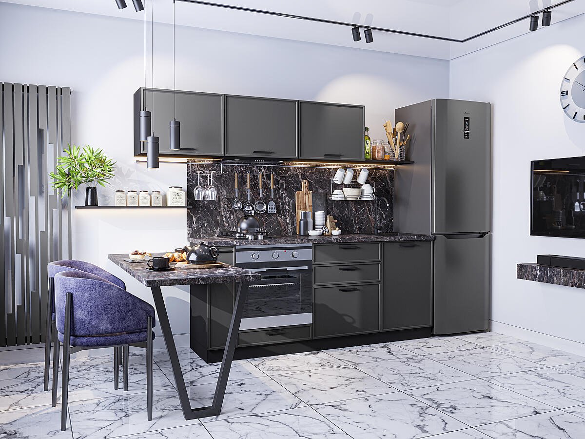 Фрейм-01 Stormy Silk 70033.Расположение Прямая. Размер (В*Ш*Г) мм 1782*2300*600. Цвет каркасов Graphite. Материал каркасов ЛДСП. Цвет фасадов Stormy Silk. Материал фасадов МДФ. Отделка фасадов ПЭТ. Толщина кромки мм .Внимание Ручка в комплект не входит.. Стекло . Столешница Мрамор черный. Толщина столешницы мм 38