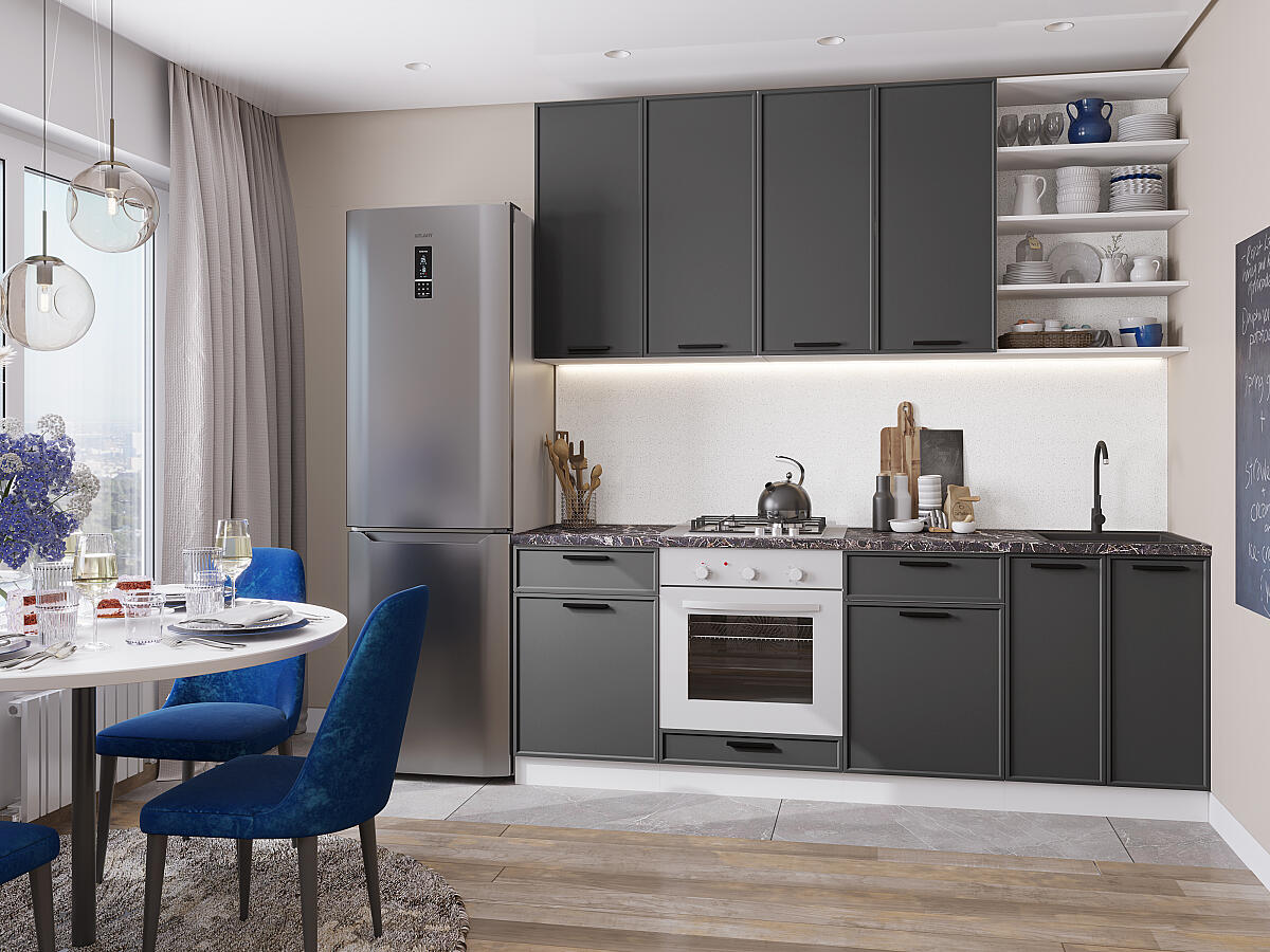 Фрейм-02 Stormy Silk 70024.Расположение Прямая. Размер (В*Ш*Г) мм 2340*2200*600. Цвет каркасов Белый. Материал каркасов ЛДСП. Цвет фасадов Stormy Silk. Материал фасадов МДФ. Отделка фасадов ПЭТ. Толщина кромки мм .Внимание Ручка в комплект не входит.. Стекло . Столешница Мрамор черный. Толщина столешницы мм 38