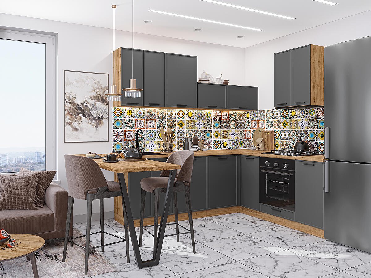 Фрейм-03 Stormy Silk 70046.Расположение Угловая. Размер (В*Ш*Г) мм 2140*2200/2000*600. Цвет каркасов Дуб Вотан. Материал каркасов ЛДСП. Цвет фасадов Stormy Silk. Материал фасадов МДФ. Отделка фасадов ПЭТ. Толщина кромки мм .Внимание Ручка в комплект не входит.. Стекло . Столешница Дуб натуральный. Толщина столешницы мм 38