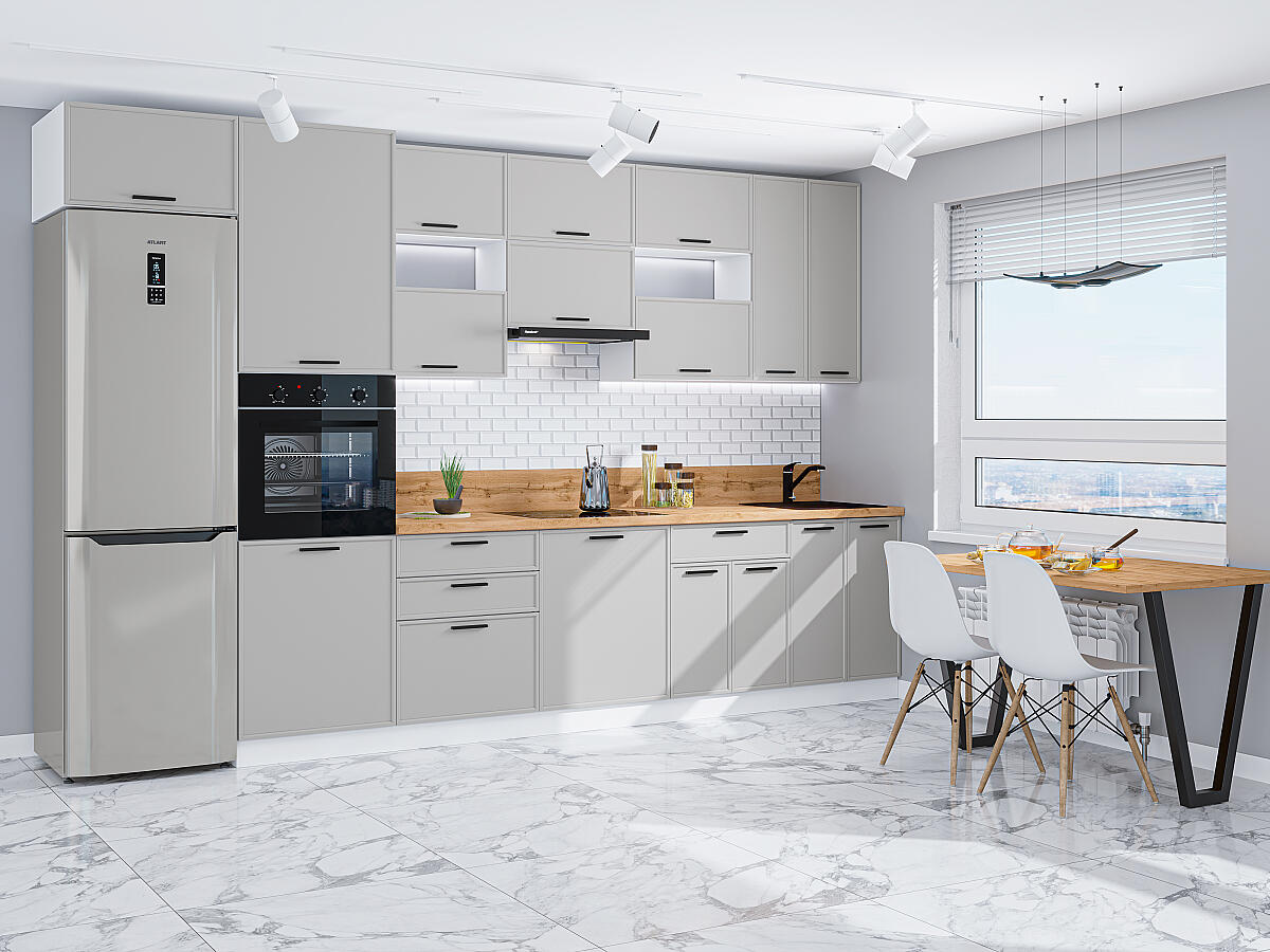 Фрейм-04 Grey Silk 71765.Расположение Прямая. Размер (В*Ш*Г) мм 2340*3600*600. Цвет каркасов Белый. Материал каркасов ЛДСП. Цвет фасадов Grey Silk. Материал фасадов МДФ. Отделка фасадов ПЭТ. Толщина кромки мм .Внимание Ручка в комплект не входит.. Стекло . Столешница Дуб натуральный. Толщина столешницы мм 38