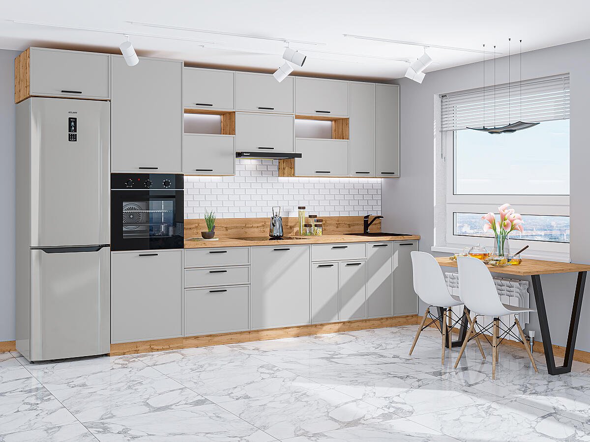 Фрейм-04 Grey Silk 71766.Расположение Прямая. Размер (В*Ш*Г) мм 2340*3600*600. Цвет каркасов Дуб Вотан. Материал каркасов ЛДСП. Цвет фасадов Grey Silk. Материал фасадов МДФ. Отделка фасадов ПЭТ. Толщина кромки мм .Внимание Ручка в комплект не входит.. Стекло . Столешница Дуб натуральный. Толщина столешницы мм 38