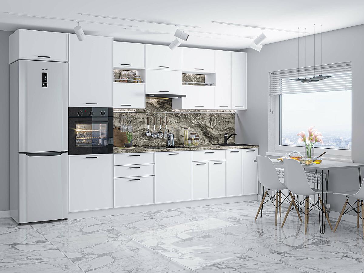 Фрейм-04 White Silk 71761.Расположение Прямая. Размер (В*Ш*Г) мм 2340*3600*600. Цвет каркасов Белый. Материал каркасов ЛДСП. Цвет фасадов White Silk. Материал фасадов МДФ. Отделка фасадов ПЭТ. Толщина кромки мм .Внимание Ручка в комплект не входит.. Стекло . Столешница Мрамор горный. Толщина столешницы мм 38