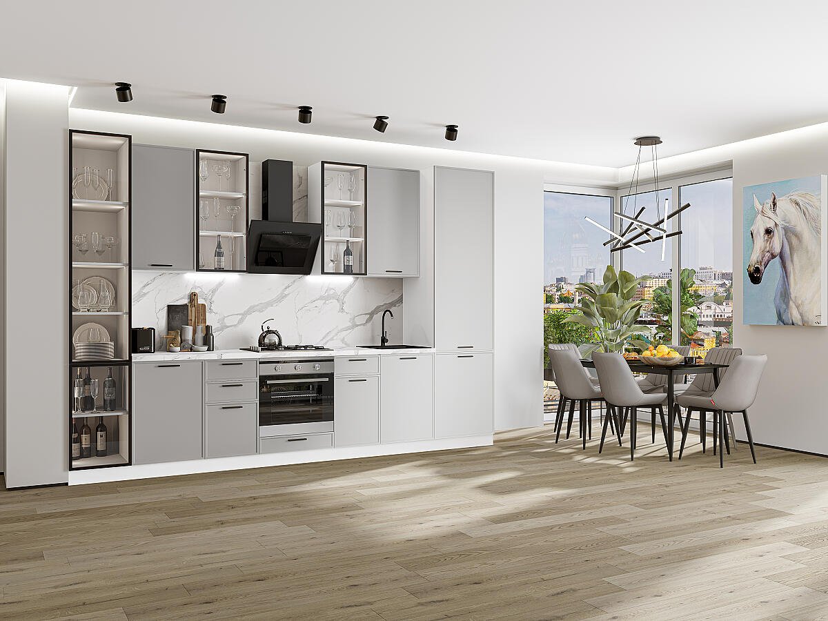 Фрейм-06 Grey Silk 79592.Расположение Прямая. Размер (В*Ш*Г) мм 2340*3400*600. Цвет каркасов Белый. Материал каркасов ЛДСП. Цвет фасадов Grey Silk. Материал фасадов МДФ. Отделка фасадов ПЭТ. Толщина кромки мм .Внимание Ручка в комплект не входит.. Стекло . Столешница Гранит белый. Толщина столешницы мм 38
