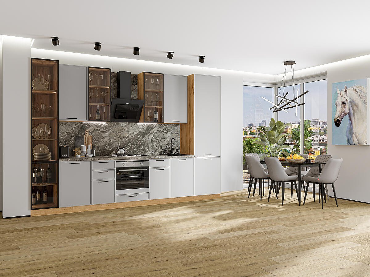Фрейм-06 Grey Silk 79593.Расположение Прямая. Размер (В*Ш*Г) мм 2340*3400*600. Цвет каркасов Дуб Вотан. Материал каркасов ЛДСП. Цвет фасадов Grey Silk. Материал фасадов МДФ. Отделка фасадов ПЭТ. Толщина кромки мм .Внимание Ручка в комплект не входит.. Стекло . Столешница Мрамор горный. Толщина столешницы мм 38