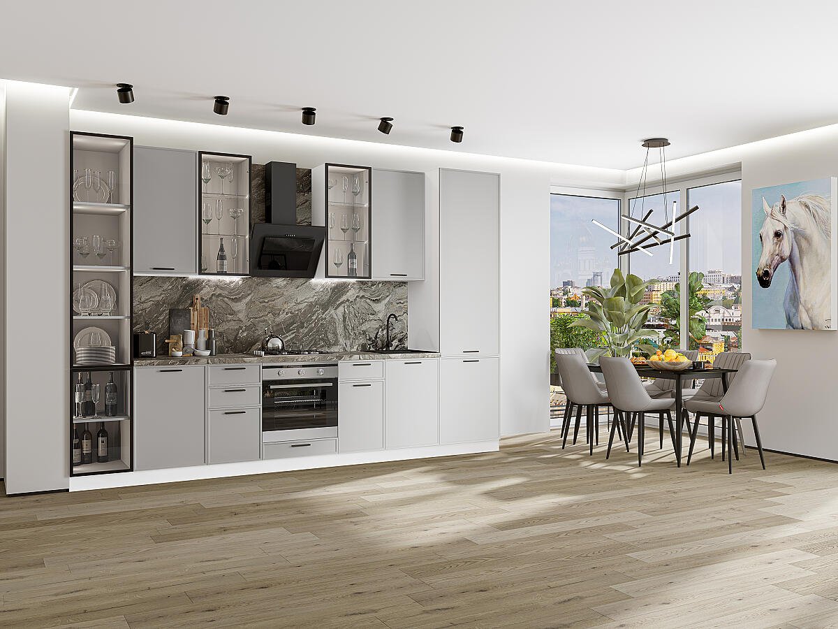 Фрейм-06 Grey Silk 79673.Расположение Прямая. Размер (В*Ш*Г) мм 2340*3400*600. Цвет каркасов Белый. Материал каркасов ЛДСП. Цвет фасадов Grey Silk. Материал фасадов МДФ. Отделка фасадов ПЭТ. Толщина кромки мм .Внимание Ручка в комплект не входит.. Стекло . Столешница Мрамор горный. Толщина столешницы мм 38