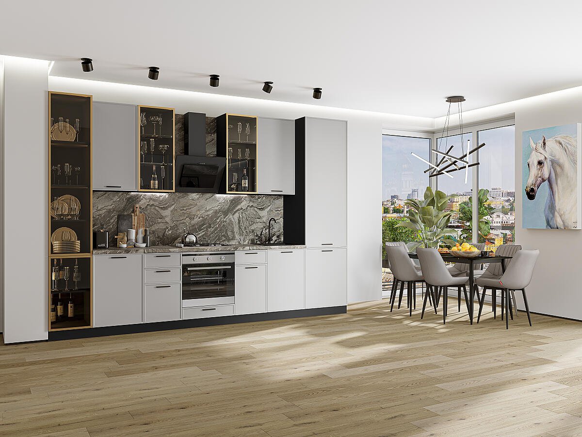 Фрейм-06 Grey Silk 79675.Расположение Прямая. Размер (В*Ш*Г) мм 2340*3400*600. Цвет каркасов Graphite. Материал каркасов ЛДСП. Цвет фасадов Grey Silk. Материал фасадов МДФ. Отделка фасадов ПЭТ. Толщина кромки мм .Внимание Ручка в комплект не входит.. Стекло . Столешница Мрамор горный. Толщина столешницы мм 38