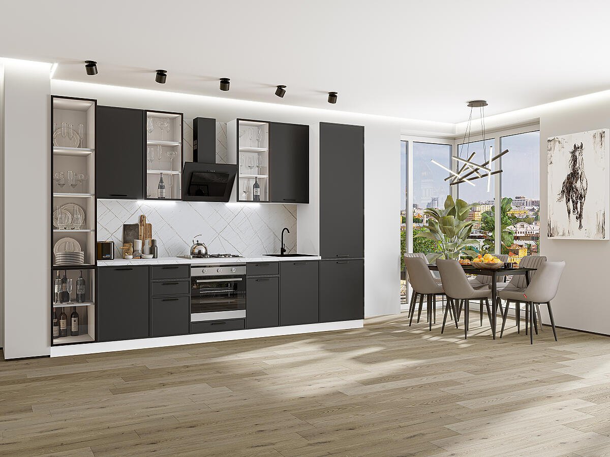 Фрейм-06 Stormy Silk 79595.Расположение Прямая. Размер (В*Ш*Г) мм 2340*3400*600. Цвет каркасов Белый. Материал каркасов ЛДСП. Цвет фасадов Stormy Silk. Материал фасадов МДФ. Отделка фасадов ПЭТ. Толщина кромки мм .Внимание Ручка в комплект не входит.. Стекло . Столешница Пирит светлый. Толщина столешницы мм 38
