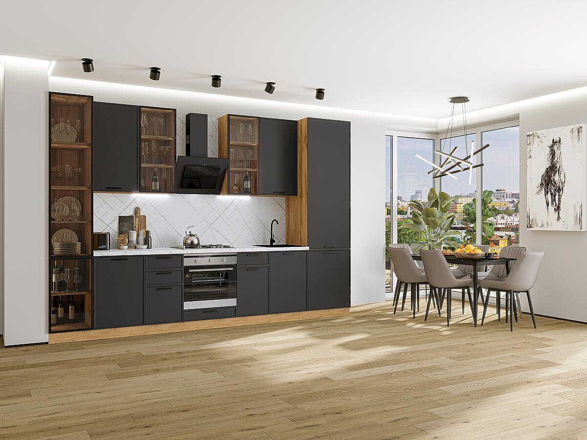 Фрейм-06 Stormy Silk 79596.Расположение Прямая. Размер (В*Ш*Г) мм 2340*3400*600. Цвет каркасов Дуб Вотан. Материал каркасов ЛДСП. Цвет фасадов Stormy Silk. Материал фасадов МДФ. Отделка фасадов ПЭТ. Толщина кромки мм .Внимание Ручка в комплект не входит.. Стекло . Столешница Пирит светлый. Толщина столешницы мм 38