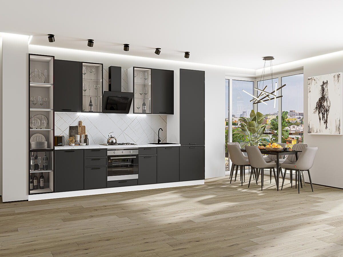 Фрейм-06 Stormy Silk 79676.Расположение Прямая. Размер (В*Ш*Г) мм 2340*3400*600. Цвет каркасов Белый. Материал каркасов ЛДСП. Цвет фасадов Stormy Silk. Материал фасадов МДФ. Отделка фасадов ПЭТ. Толщина кромки мм .Внимание Ручка в комплект не входит.. Стекло . Столешница Пирит светлый. Толщина столешницы мм 38