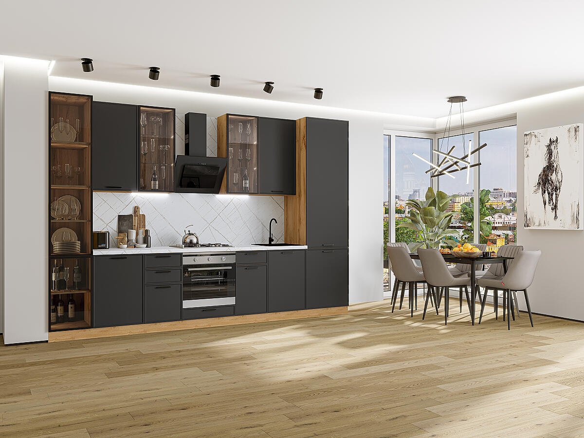 Фрейм-06 Stormy Silk 79677.Расположение Прямая. Размер (В*Ш*Г) мм 2340*3400*600. Цвет каркасов Дуб Вотан. Материал каркасов ЛДСП. Цвет фасадов Stormy Silk. Материал фасадов МДФ. Отделка фасадов ПЭТ. Толщина кромки мм .Внимание Ручка в комплект не входит.. Стекло . Столешница Пирит светлый. Толщина столешницы мм 38