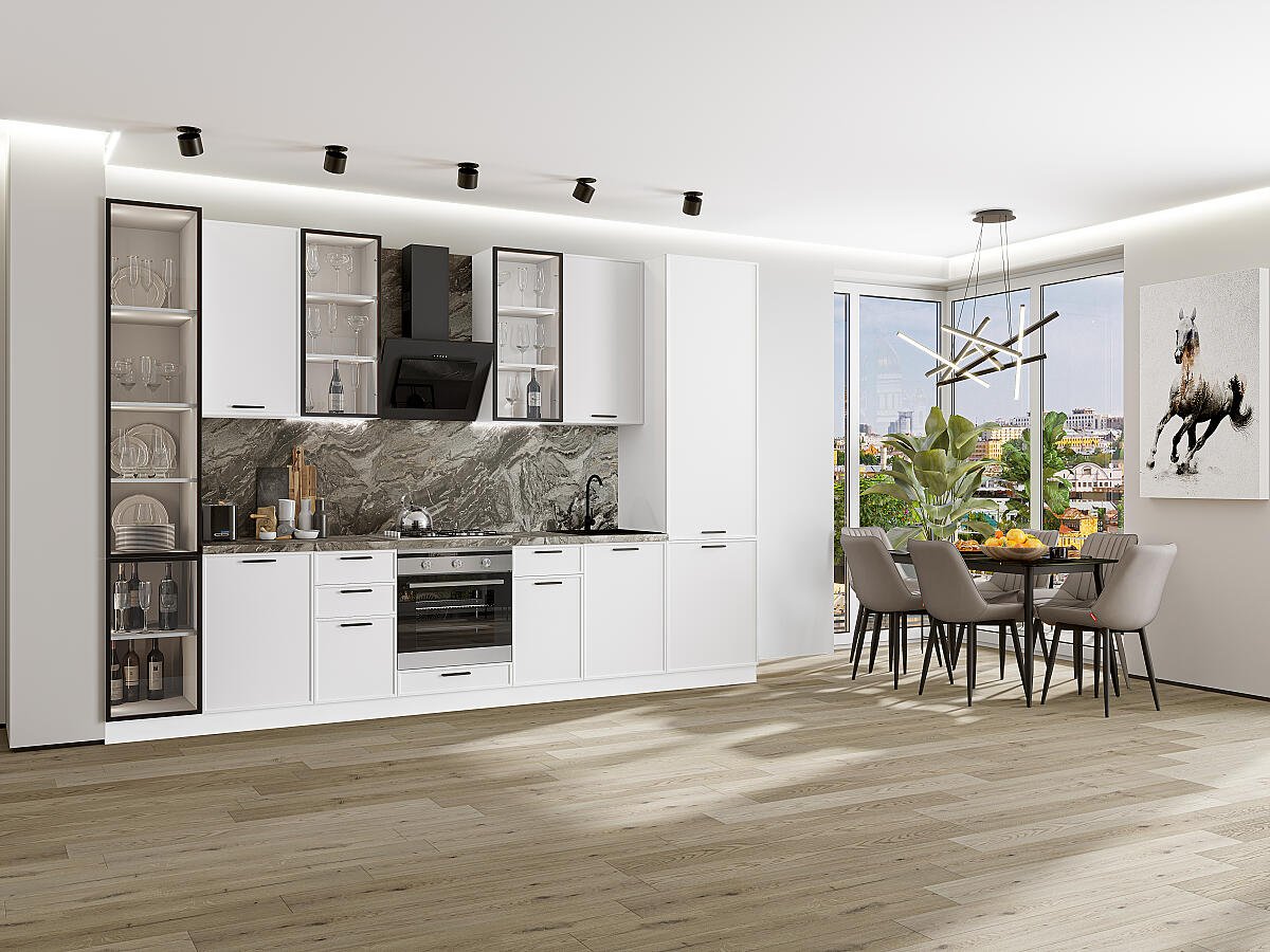 Фрейм-06 White Silk 79586.Расположение Прямая. Размер (В*Ш*Г) мм 2340*3400*600. Цвет каркасов Белый. Материал каркасов ЛДСП. Цвет фасадов White Silk. Материал фасадов МДФ. Отделка фасадов ПЭТ. Толщина кромки мм .Внимание Ручка в комплект не входит.. Стекло . Столешница Мрамор горный. Толщина столешницы мм 38