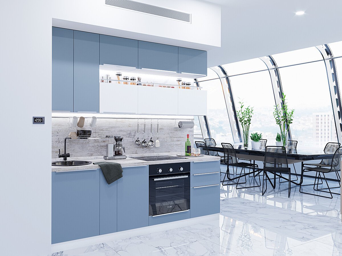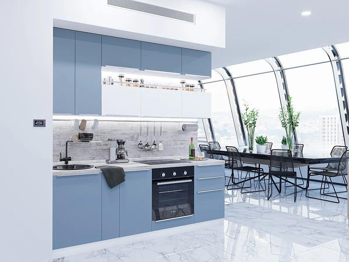 Фьюжн-01 Silky Blue/Silky White 52368.Расположение Прямая. Размер (В*Ш*Г) мм 2340*2300*600. Цвет каркасов Белый. Материал каркасов ЛДСП. Цвет фасадов Silky Blue/Silky White. Материал фасадов МДФ. Отделка фасадов ПЭТ. Толщина кромки мм 1.Внимание Ручка в комплект не входит.. Стекло . Столешница Винтажная сосна. Толщина столешницы мм 38