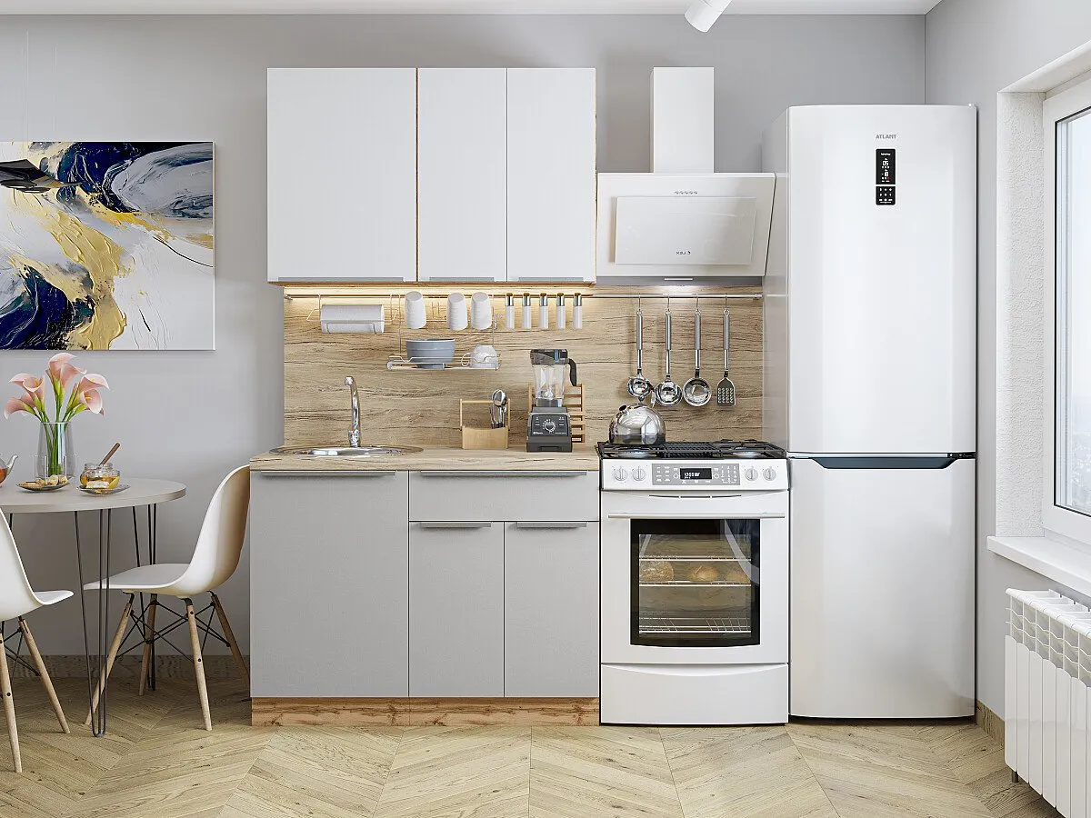 Фьюжн-05 Silky White/Silky Light Grey 66739.Расположение Прямая. Размер (В*Ш*Г) мм 2140*1100*600. Цвет каркасов Дуб Вотан. Материал каркасов ЛДСП. Цвет фасадов Silky White/Silky Light Grey. Материал фасадов МДФ. Отделка фасадов ПЭТ. Толщина кромки мм 1.Внимание Ручка в комплект не входит.. Стекло . Столешница Редондо. Толщина столешницы мм 38